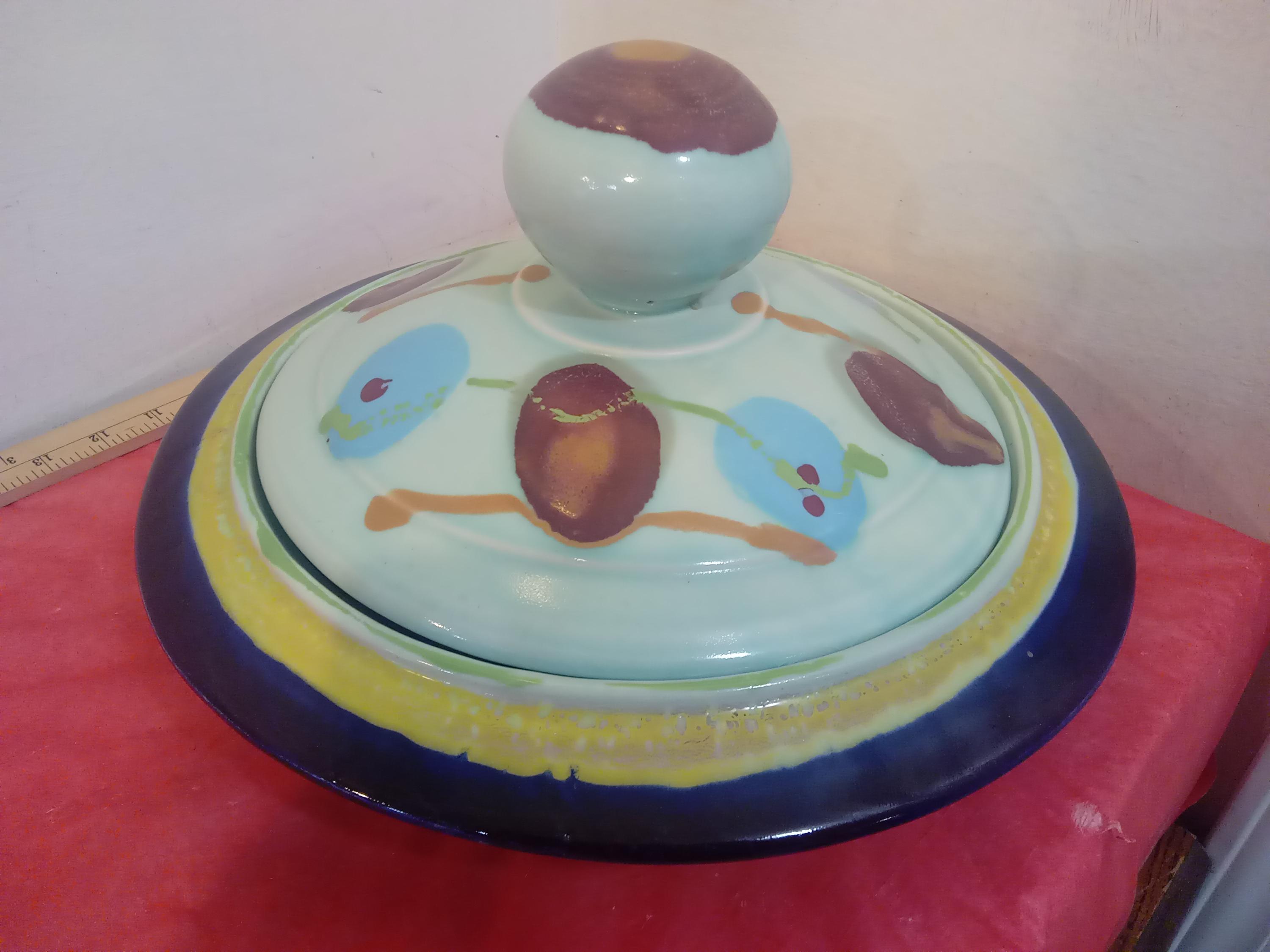 Vintage Large Serving Bowl, North Carolina Pottery Large Serving Bowl with Lid, Blue Bottom Decorative Lid