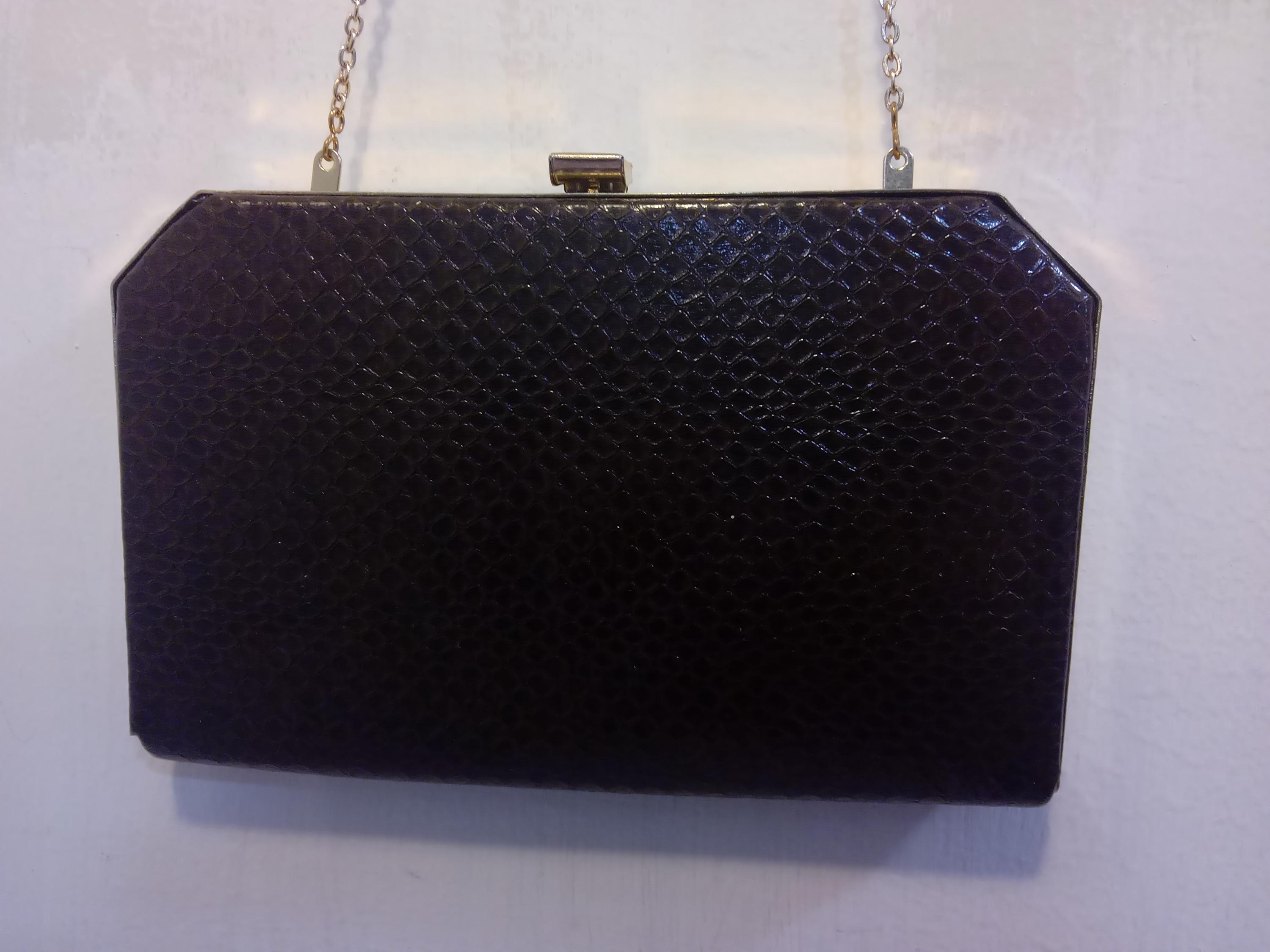 The reptile print purse I am unsure if embossed or real thing, it does need to be cleaned but since unsure of material I didn't want to accidently stain it so left it the way it is. It is about 8" x 5" and has the longest chain of all the purses.